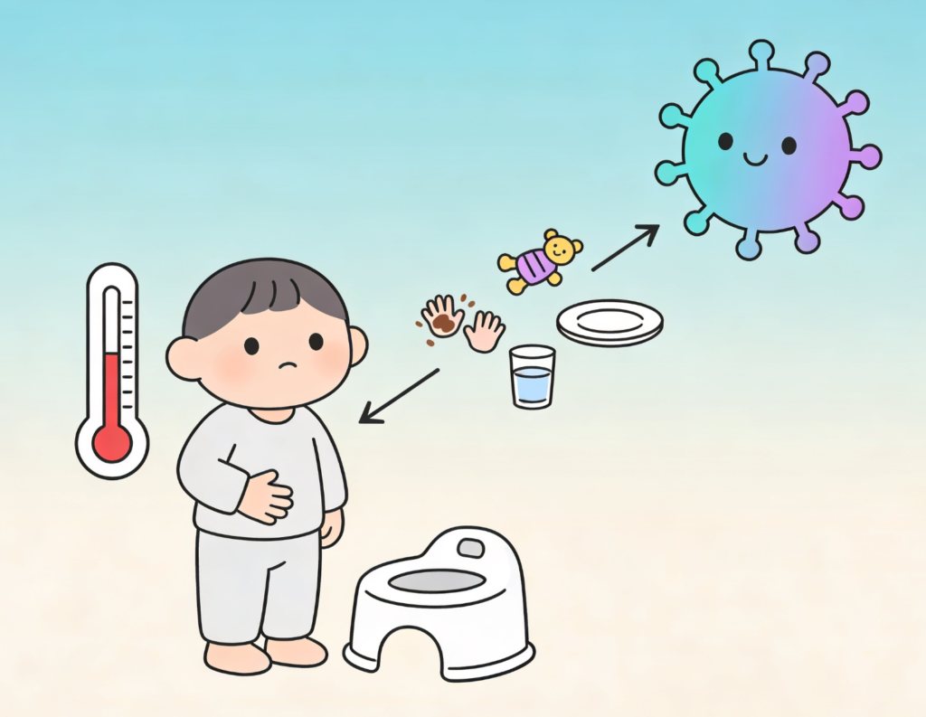 Ротавирус — одна из самых частых причин острого гастроэнтерита у детей, особенно в возрасте от 6 месяцев до 5 лет. Вирус поражает клетки тонкого кишечника, вызывает рвоту, диарею и быстрое обезвоживание. Заражение происходит фекально‑оральным путем: через грязные руки, игрушки, воду, пищу и общие поверхности.