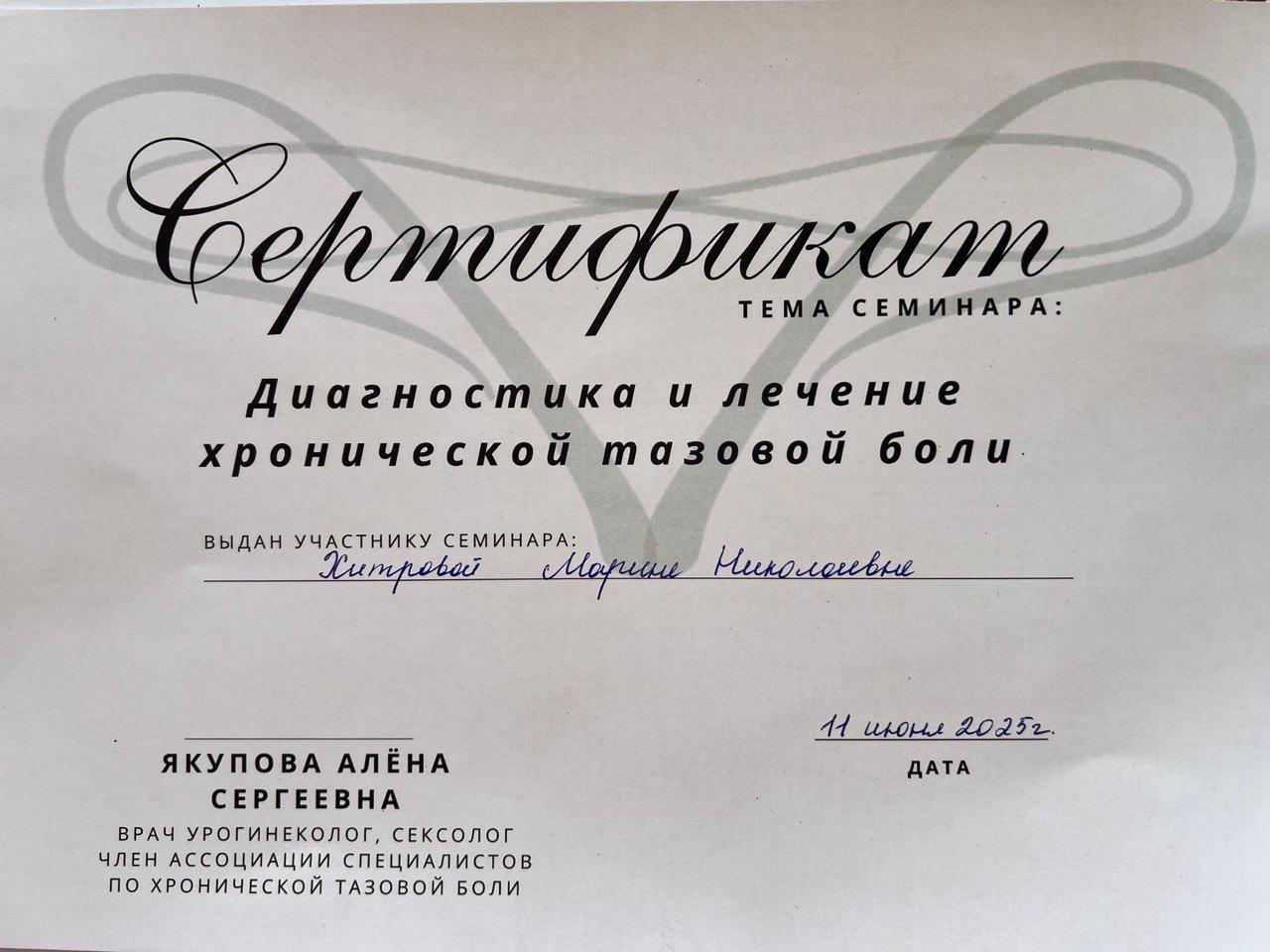 2017Обучение по программе «Малоинвазивные методы коррекции дисфункции тазового дна у женщин», «Эстетическая гинекология, скульптура промежности» УроСЭМ г. Челябинск.