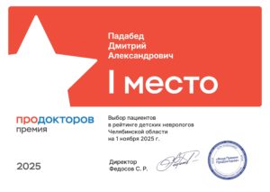 По результатам премии ПроДокторов: 1 место в рейтинге детских неврологов Челябинской области на 5 ноября 2025 года.