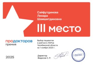 Щеткова Олеся Владимировна по результатам премии ПроДокторов: заняла 1 место в рейтинге детских оториноларингологов, а Сайфутдинова Линара Шамшитдиновна 3 место среди взрослых ЛОР- врачей по Челябинской области на 1 ноября 2025 года.